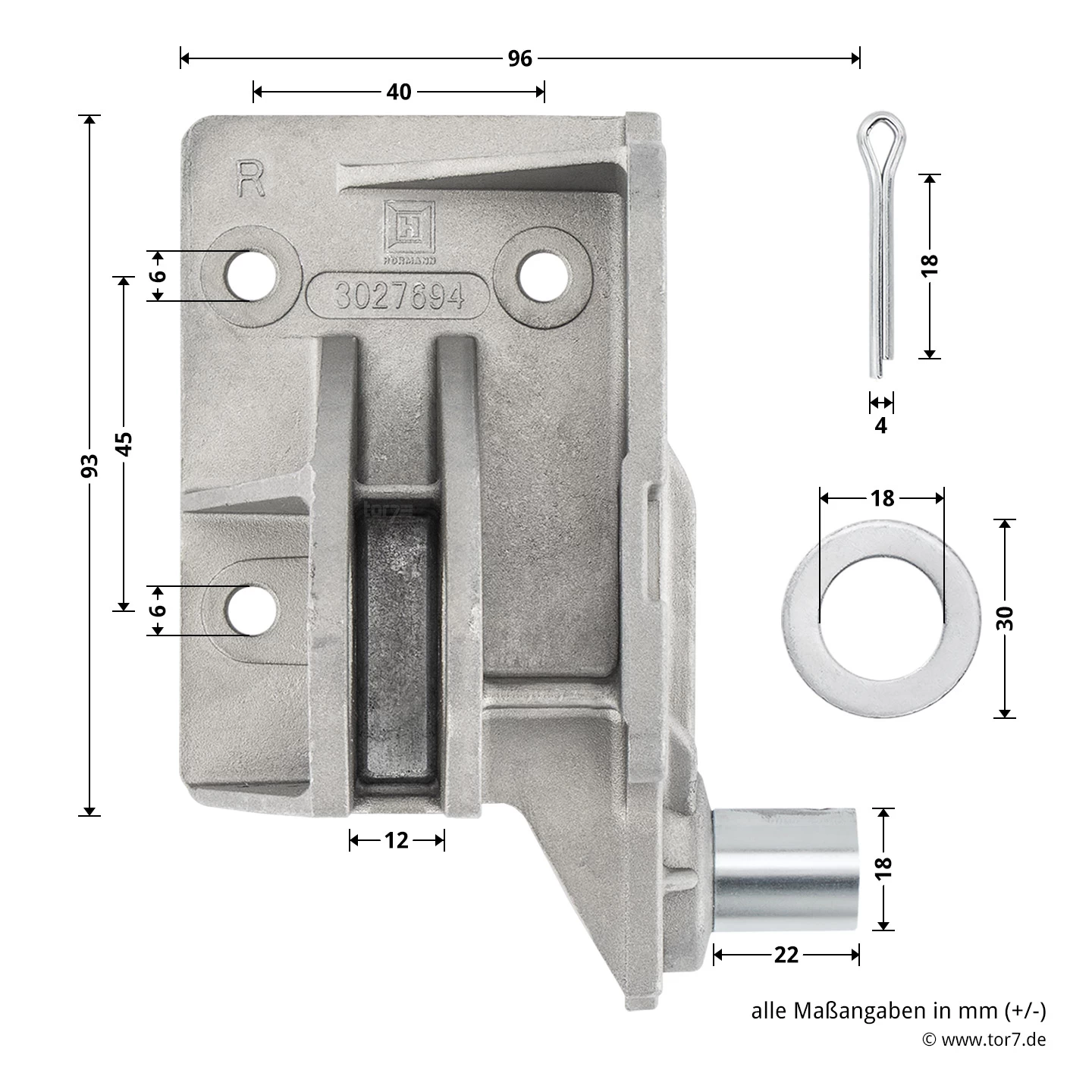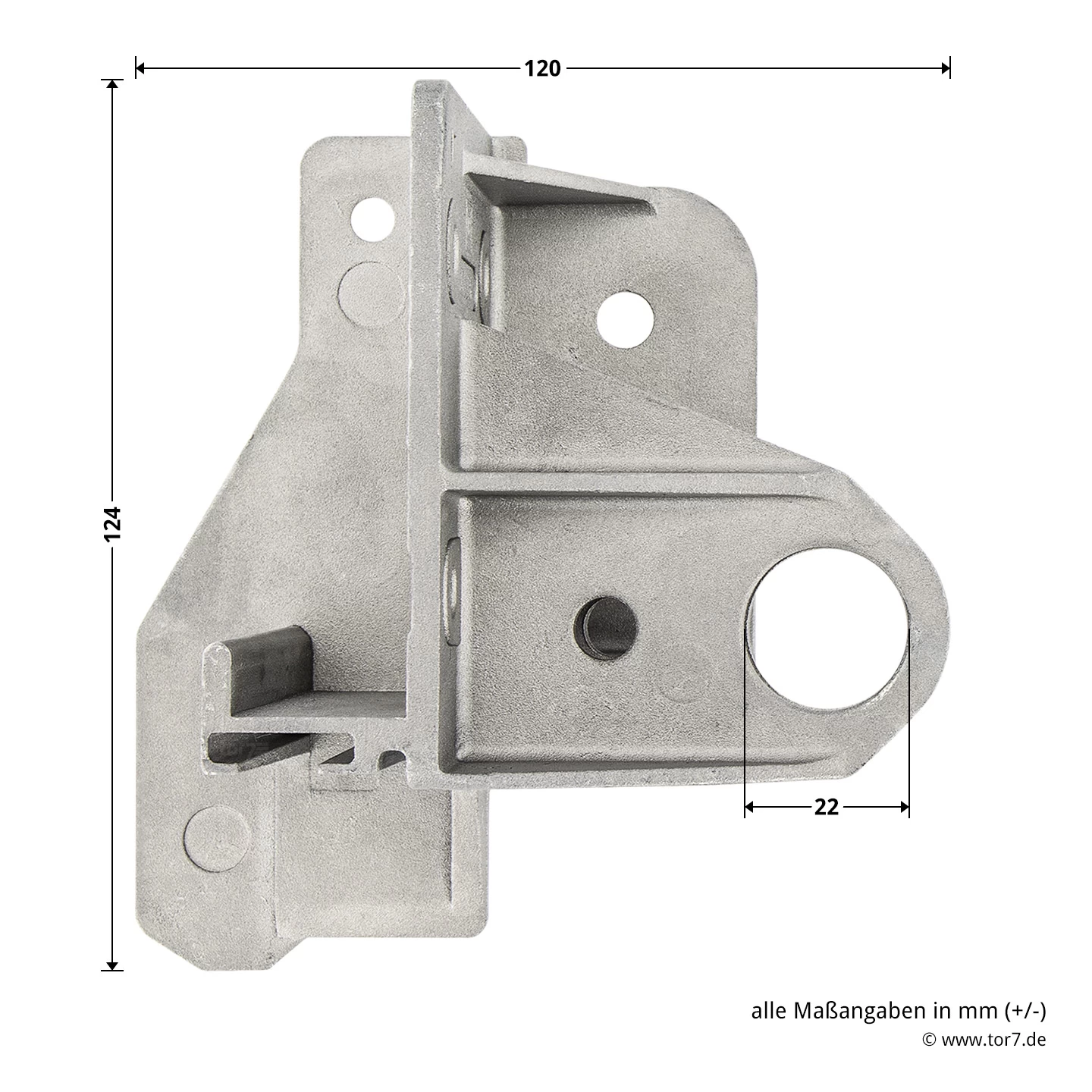 Das Hörmann Aufsetzstück rechts wird ausschließlich bei Hörmann Industrie-Sektionaltoren der Baureihe 20 mit Produktionszeitraum ab 25.08.1986 bis 07.07.1992, die mit einem N-Beschlag ausgestattet sind, eingesetzt. Diese Torausführungen mit Normal-Beschlag sind mit einer Torsionsfederwelle oberhalb des Tores ausgestattet, welche für einen verlässlichen Gewichtsausgleich sorgt. Das Aufsetzstück ist unten rechts an der Bodensektion montiert und mit der notwendigen Aufnahme für die Seilkausche versehen. Bei der intervallmäßigen Torwartung sollte daher auch dieses Bauteil auf Korrosion oder Beschädigungen überprüft werden und bei einem festgestellten Mangel ein umgehender Austausch gegen dieses Ersatzteil der Firma Hörmann erfolgen. Das gewährleistet auch bei älteren Toranlagen einen ordnungsgemäßen und sicheren Torbetrieb. Befestigt wird das Aufsetzstück mit der Hörmann Sechskant-Blechschraube, A 6,5 x 20 mm mit korrosionsbeständiger Dacromet-Beschichtung.