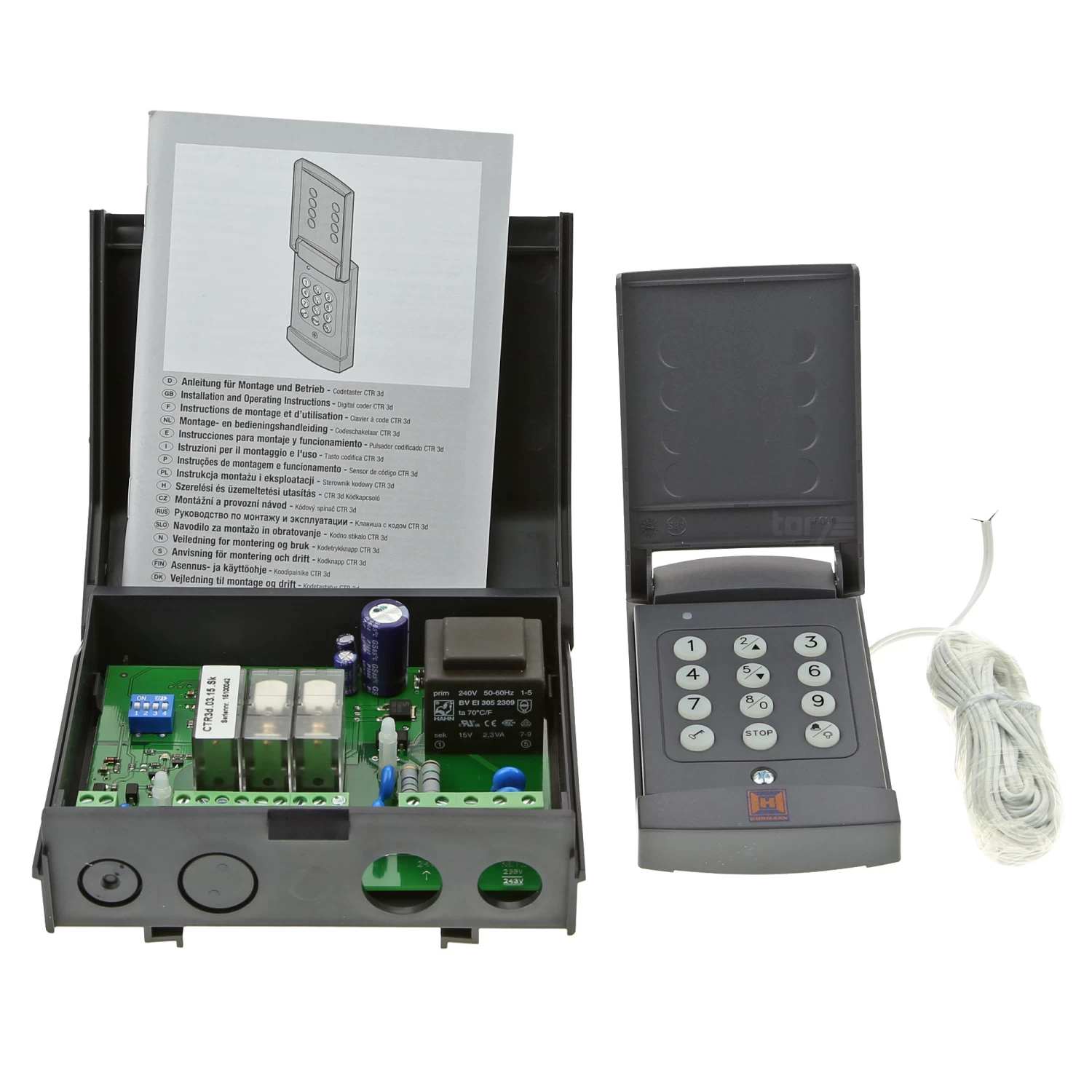 Außer der Bedienungsanleitung erhalten Sie bei der Bestellung von einem CTR 3d die Auswerteeinheit und die Eingabeeinheit mit Tastatur. An dieser ist ein 5 m langes Verbindungskabel zur Auswerteeinheit befestigt, welches noch bis auf 20 m verlängert werden kann. Für die Verbindung von der Auswerteeinheit zum Antrieb oder die Stromversorgung mit 24 V eignet sich eine Anschlussleitung ASL, welche auf Anfrage in Längen 2 m, 10 m oder 50 m (auf Rolle) bei uns erhältlich ist. Für die Stromversorgung mit 230 V kommen die Hörmann Anschlussleitung ZL 1 oder die Hörmann Anschlussleitung ZLE 1 infrage. Die robuste Tastatur ist modern gestaltet und lediglich 76 x 76 x 13 mm groß. Der CTR 3d kann alle Hörmann-Antriebe, Antriebe anderer Hersteller oder elektrische Türöffner steuern.