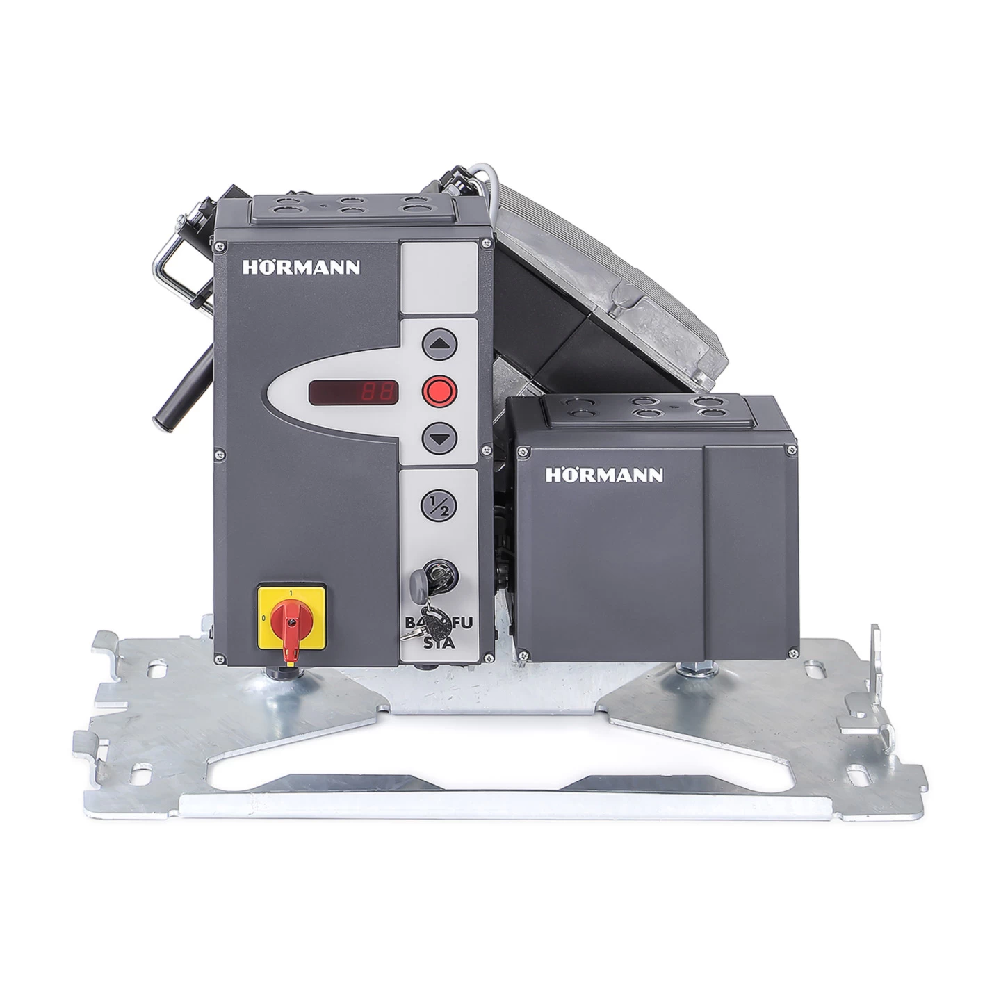 Die Industrietorsteuerung B460 FU STA ist serienmäßig mit im Lieferumfang enthalten. Da sich die Steuerung in einem separaten Gehäuse befindet, kann sie wahlweise unterhalb der abschließbaren Antriebshaube oder auch separat außerhalb dieser installiert werden. Auf dem Steuerungsgehäuse befindet sich zudem ein eingebautes, einstellbares Bedienelement mit den Tasten Tor-Auf, Stopp, Tor-Zu und Teilöffnung. Über ein Miniaturschloss ist es außerdem möglich, das Bedienfeld, aber auch die Bedienung über externe Geräte zu sperren.