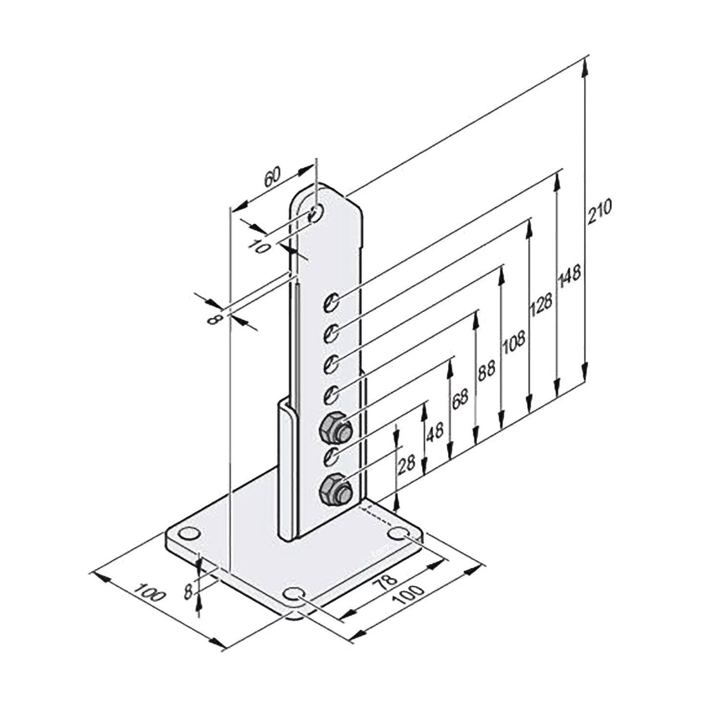 Beide Standardbeschläge haben gemeinsam, dass mit Ihnen der Torantrieb nah hinter der Pfostenrückseite in Abständen von ca. 80 – 115 mm angebracht wird. Es gibt jedoch Einbausituationen, bei denen dieser Abstand zu gering ist und daher ein entsprechend längerer SOMMER Torpfostenbeschlag 60/210 twist 200 E/EL/350 erforderlich ist. Der zweiteilige Beschlag besteht wieder aus einer 100 x 100 mm großen Grundplatte, auf der sich seitlich ein Träger befindet. In diesem Träger wird dann eine ca. 220 mm lange Lasche eingesteckt und mit zwei Schrauben verschraubt. In der Standardposition verschraubt würde sich die Bohrung für den Antrieb in einem Abstand von 210 mm zur Basis der Grundplatte befinden. Da jedoch mehrere Löcher zum Verschrauben zur Verfügung stehen, kann die Lasche auch mit verschiedenen Distanzen angebracht werden. Weiterhin besteht auch die Möglichkeit, die Lasche zu verkürzen, damit Sie den Antrieb auch in einem geringeren Abstand als 210 mm zur Pfostenrückseite anbringen können.